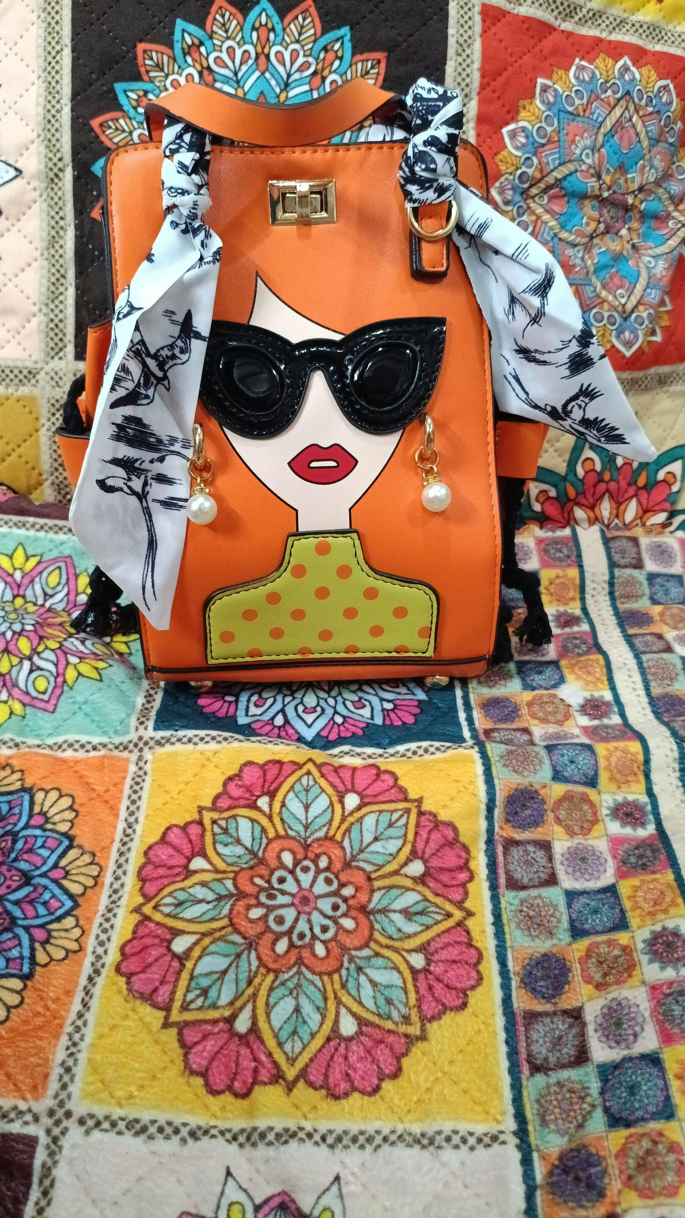 - Features a quirky 3D lady face design with sunglasses and bold lip detailing for a playful statement look.